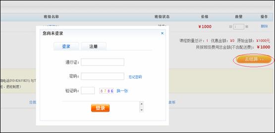 选课结束后,确定无误,点击“去结算”按钮,如果您是网站新用户,请点击“注册”,注册成功后结算,已注册用户直接登录后结算。