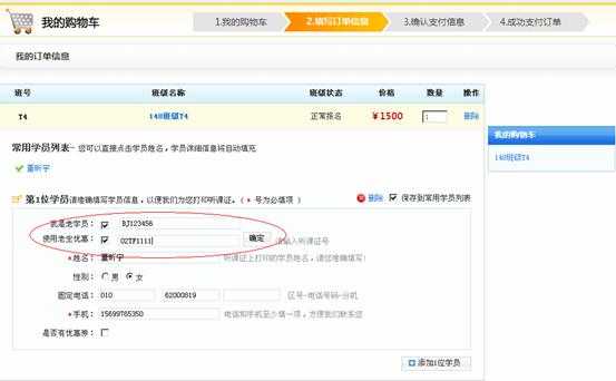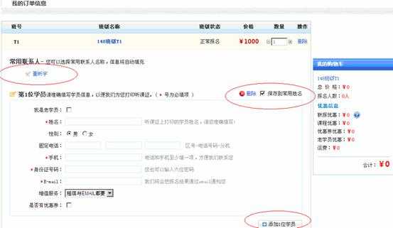 如果为多个学员同时报这个班级,可以点击学员信息右下方“添加1位学员”按钮。系统将会添加第二位学员的信息录入框,录入信息即可。