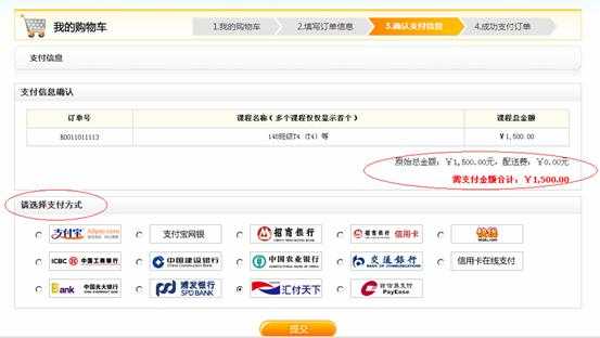 确认支付页面将显示支付订单信息及支付方式,请在此界面确认报名单号、班号、费用等信息,再选择支付银行(其中支付宝、快钱、汇付天下是中立第三方网上支付平台,它们支持国内大部分银行卡支付),选择后,请点击“提交”按钮。