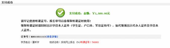 订单支付成功后,系统会自动完成报名,同时,您在页面上还将看到听课证信息,请牢记您的听课证号、订单号,以备领取听课证时使用。