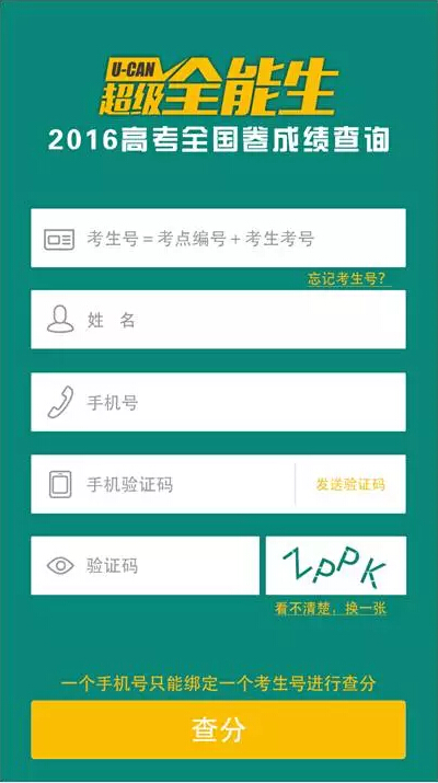 二、成绩查询 输入您完整的准考证号、姓名、手机号及验证码,点即查分可查到分数