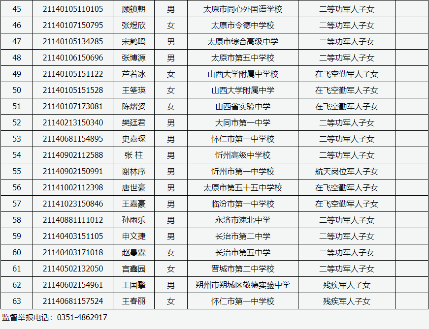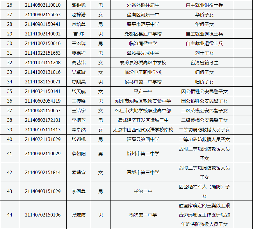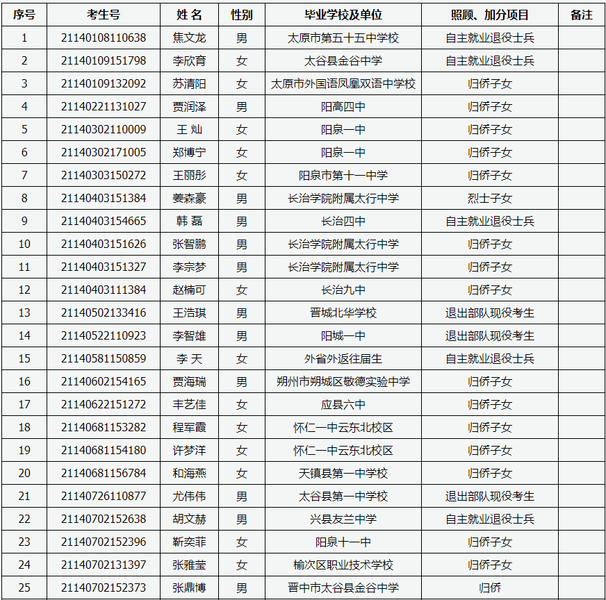 山西省2021年普通高校招生考试照顾、加分资格考生名单