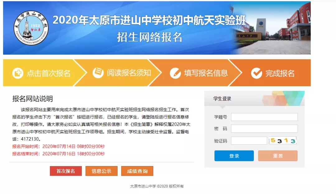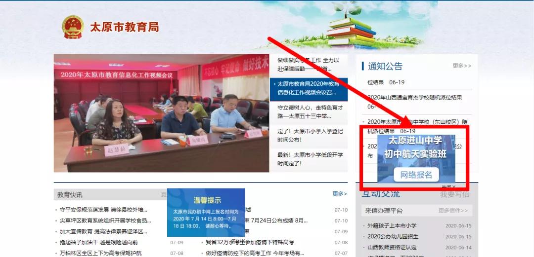2020年7月14日8:00——7月16日18:00,家长们可使用电脑登陆太原市教育局官网http://jyj.taiyuan.gov.cn/(点击进入),进行网上报名。